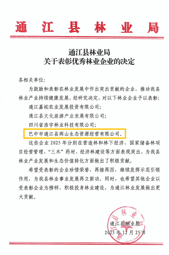 近日,巴中兩山公司被巴中市林業(yè)局通報表揚為2025年度林業(yè)重點工作“表現(xiàn)突出單位”。下屬企業(yè)通江縣兩山公司被通江縣林業(yè)局授予“優(yōu)秀林業(yè)企業(yè)”稱號。