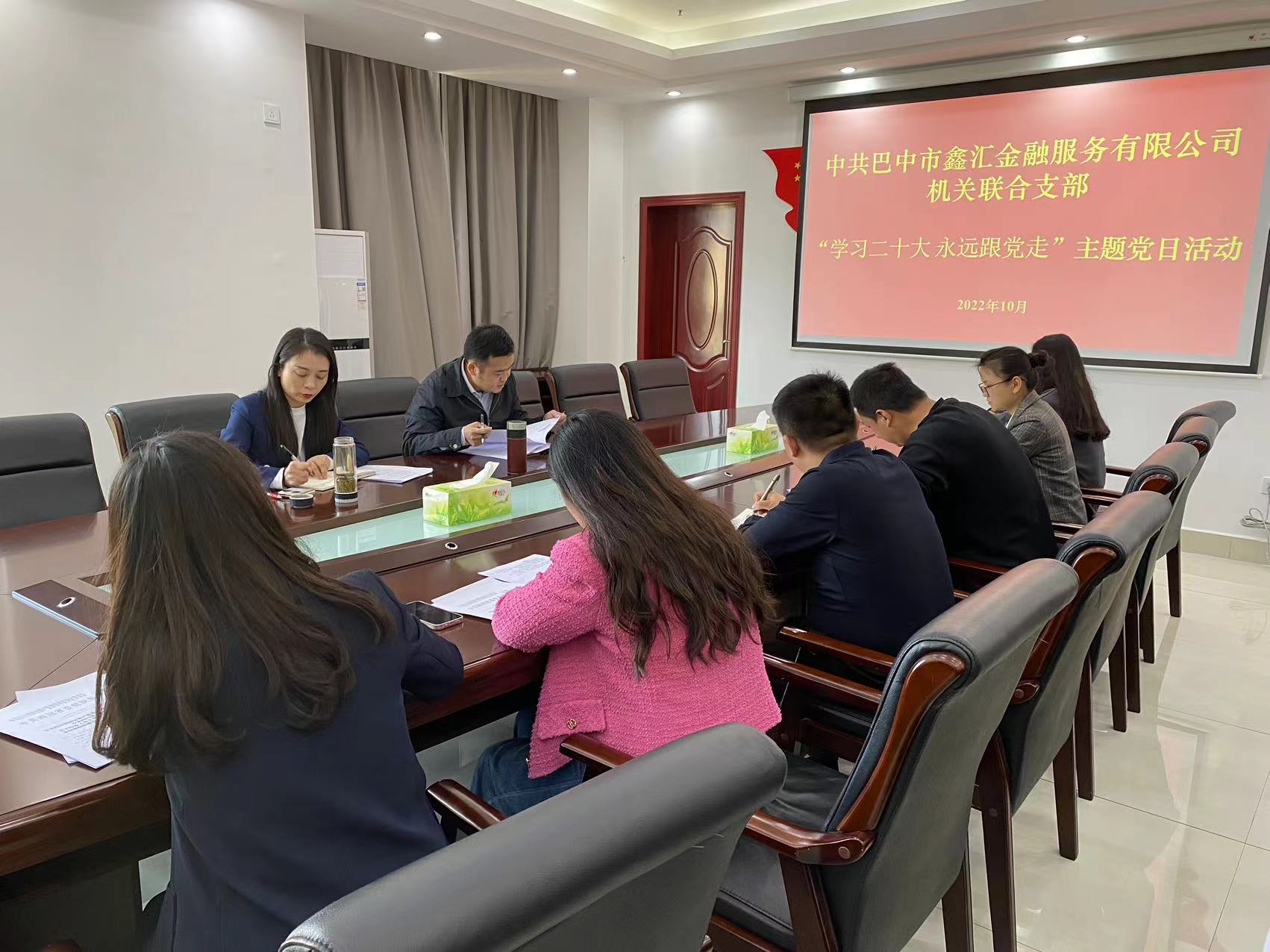 為深入學習宣傳貫徹黨的二十大精神,10月31日,中共巴中市鑫匯金融服務(wù)有限公司機關(guān)聯(lián)合支部開展“學習黨的二十大 永遠跟黨走”主題活動,機關(guān)聯(lián)合支部全體黨員、公司全體職工參加。